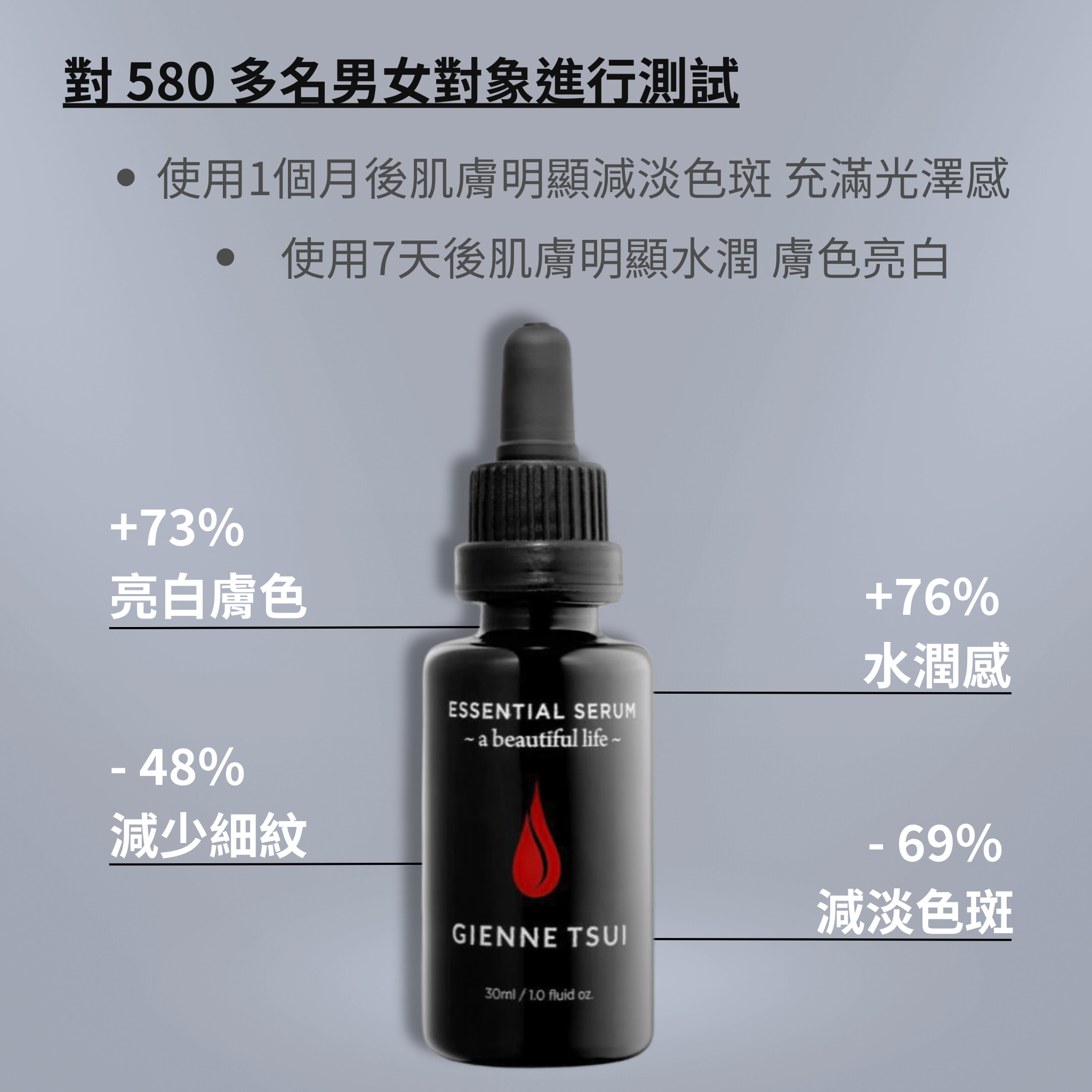 • 超過580名用戶使用7天後感受肌膚水潤提升76%。