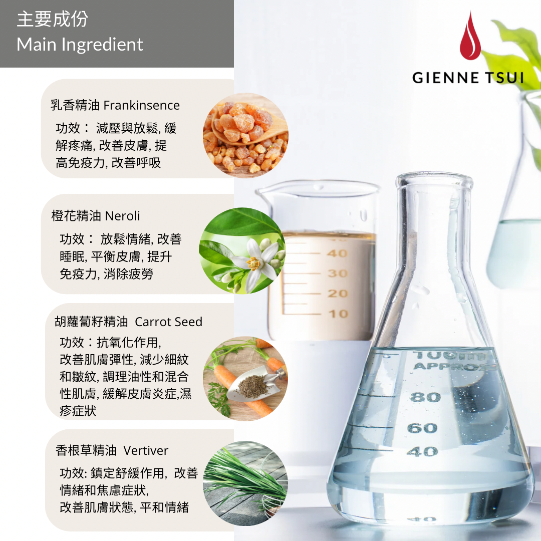 • 有機橙花、乳香、香根草與胡蘿蔔籽精油,舒緩抗炎並增添天然香氛療效