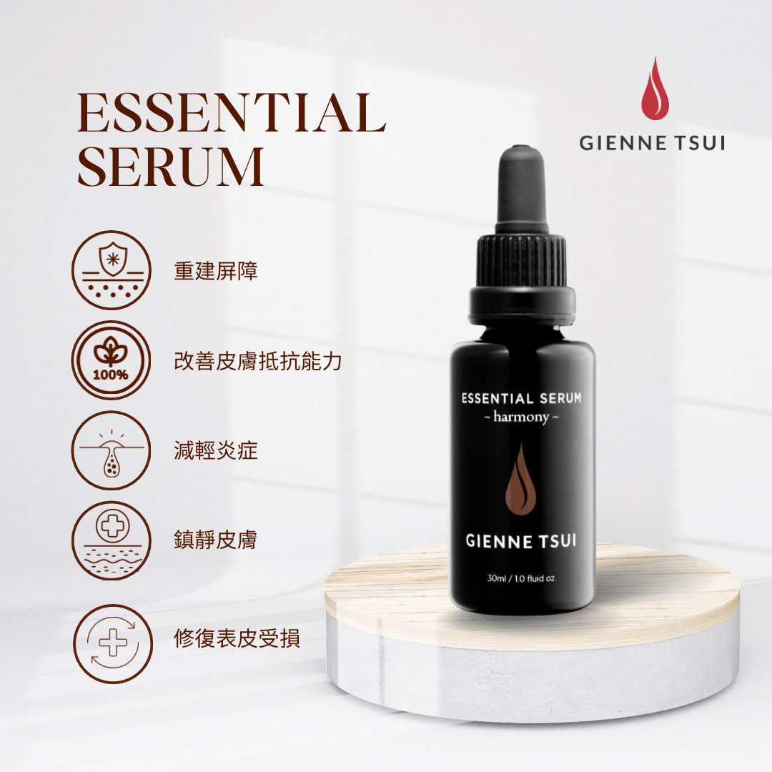 Harmony Essential Serum 選取有機玫瑰果油為主成分,富含必需脂肪酸與維生素C,持續滋養並促進膠原蛋白生成。可可巴油與牛油果油提供深層滋養,修復肌膚屏障並保濕持久。有機德國洋甘菊油及香蜂草油舒緩抗炎,緩解敏感不適。有機廣藿香油除延展護膚效益外,更增添自然芳香,使日常護膚過程充滿療癒感。產品質地輕盈細膩,快速吸收,適合各種肌膚長期使用。